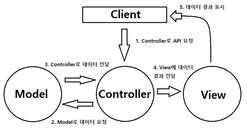 위의 그림처럼 Client는 Controller에 API를 요청➡️Controller는 Model에게 데이터 요청➡️다시 데이터를 Controller에 전달➡️Controller는 받은 데이터를 View에 전달➡️View는 데이터를 시각화하여 Client에 전달하여 표시